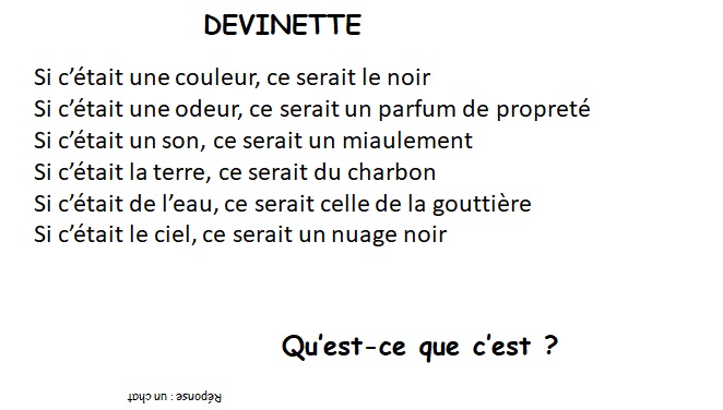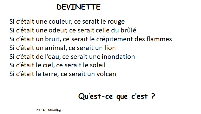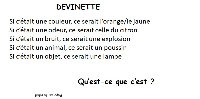 Archives 2021, PERISCOLAIRE DEVINETTES DES 6ème 3 septembre 2021 Admin Les amis de la Bienvenue Laisser un commentaire L’atelier français de Catherine avec Mahamadou, Shahd et les autres vous ont concocté des devinettes sur le mode du « Si c’était » : Partager : Cliquer pour partager sur X(ouvre dans une nouvelle fenêtre) X Cliquez pour partager sur Facebook(ouvre dans une nouvelle fenêtre) Facebook J’aime chargement… Similaire